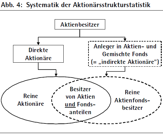 Die Zahl der Anleger in Aktienfondsanteilen (indirekte Aktionäre, Abb. 3) stieg im zweiten Halbjahr 2011 um über eine Million (16,8 %) auf 7,2 Mio. Damit halten 11,2 % der Bevölkerung Anteile an Aktien- oder Gemischten Fonds. Im langjährigen Vergleich liegt die Zahl der Aktienfondsanleger um 4,9 Mio. über dem Wert des Jahres 1997 (+212,5 %), aber noch um 2,6 Mio. unter dem Rekordstand des Jahres 2001 (-26,1 %). Die Zahl der Anleger, die ausschließlich Anteile an Aktienfonds besaßen, stieg im ersten Halbjahr 2012 um 652.000 auf 3,9 Mio. (6,0 % der Bevölkerung). Die Zahl der Anleger ausschließlich in Gemischten Fonds nahm um 477.000 auf 2,7 Mio. (4,2 %) zu. Mit einem Rückgang um 90.000 auf 619.000 (1,0 %) ist die Zahl der Anleger, die gleichzeitig in Aktien- und Gemischte Fonds investierten, als einzige der beobachteten Teilgruppen gesunken.