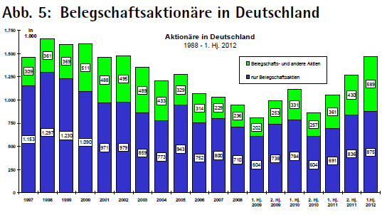 Von den Direktanlegern sind 875.000 reine Belegschaftsaktionäre (1,4 % der Bevölkerung). 589.000 Anleger (0,9 %) besitzen zusätzlich zu Belegschaftsaktien auch andere Aktien; 3,4 Mio. Anleger (5,3 %) halten ausschließlich andere Aktien. Die Gesamtzahl der Belegschaftsaktionäre beträgt 1,5 Mio. Sie ist seit 1988 um 375.000 (34,4 %) gestiegen, doch seit dem Höchststand im Jahr 2000 um 194.000 (11,7 %) gesunken.