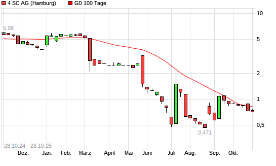 Mit dem Rücksetzer auf 0,66 EUR hat die 4SC-Aktie am 27.10.2025 die 100-Tage-Linie nach unten gekreuzt.Die 4SC-Aktie befindet sich seit dem 26.02.2025 im langfristigen Abwärtstrend und ...weiterlesen