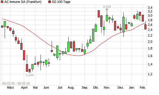 Mit dem Rücksetzer auf 2,53 EUR hat die AC Immune SA-Aktie am 05.02.2026 die 100-Tage-Linie nach unten gekreuzt.Die AC Immune SA-Aktie befindet sich seit dem 18.09.2025 im langfristigen ...weiterlesen