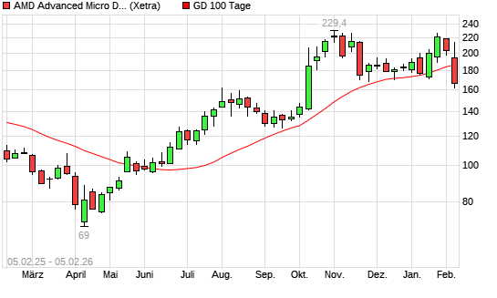Mit dem Rücksetzer auf 171,70 EUR hat die AMD-Aktie am 04.02.2026 die 100-Tage-Linie nach unten gekreuzt.Die AMD-Aktie befindet sich seit dem 24.06.2025 im langfristigen ...weiterlesen