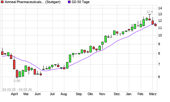 Mit dem Rücksetzer auf 11,30 EUR hat die AMNEAL PHMCTCLS,-Aktie am 03.03.2026 die 50-Tage-Linie nach unten gekreuzt.Der Abstand zur 200-Tage-Linie beträgt aktuell +26,20%. ...weiterlesen