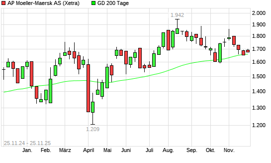 Mit dem Anstieg auf 1.699,00 EUR hat die AP Moeller-Maersk A-Aktie am 24.11.2025 die 200-Tage-Linie nach oben gekreuzt.Die AP Moeller-Maersk A-Aktie befand sich seit dem 21.11.2025 im langfristigen ...weiterlesen