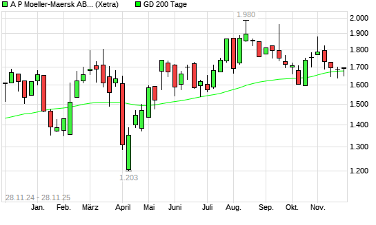 Mit dem Anstieg auf 1.696,50 EUR hat die AP Moeller-Maersk B-Aktie am 27.11.2025 die 200-Tage-Linie nach oben gekreuzt.Die AP Moeller-Maersk B-Aktie befand sich seit dem 26.11.2025 im langfristigen ...weiterlesen