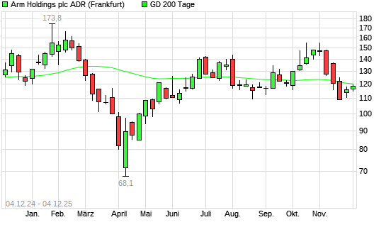 Mit dem Anstieg auf 119,80 EUR hat die ARM Holdings-Aktie am 03.12.2025 die 200-Tage-Linie nach oben gekreuzt.Die ARM Holdings-Aktie befand sich seit dem 13.11.2025 im langfristigen Aufwärtstrend ...weiterlesen