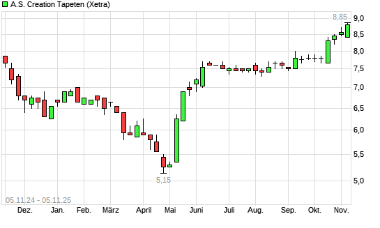Mit dem Anstieg auf 8,60 EUR hat die A.S. Creation Tapeten-Aktie (ISIN DE000A1TNNN5) am 04.11.2025 ein neues 12-Monats-Hoch erreicht und damit den Kurs vom 30.10.2025 eingestellt.Die A.S. Creation ...weiterlesen
