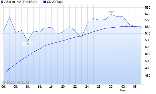 Mit dem Rücksetzer auf 550,40 EUR hat die ASM International-Aktie am 05.11.2025 die 20-Tage-Linie nach unten gekreuzt.Die ASM International-Aktie befindet sich seit dem 18.09.2025 im langfristigen ...weiterlesen