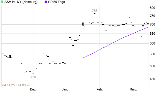 Mit dem Rücksetzer auf 680,00 EUR hat die ASM International-Aktie am 13.03.2026 die 50-Tage-Linie nach unten gekreuzt.Die ASM International-Aktie befindet sich seit dem 02.12.2025 ...weiterlesen