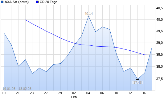 Mit dem Anstieg auf 39,72 EUR hat die AXA-Aktie am 20.02.2026 die 100-Tage-Linie nach oben gekreuzt.Die AXA-Aktie befindet sich seit dem 09.01.2026 im langfristigen Abwärtstrend und hat ...weiterlesen