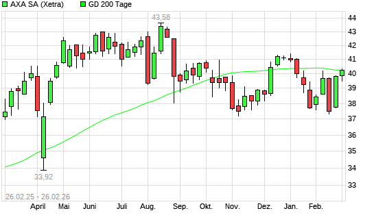 Mit dem Anstieg auf 40,29 EUR hat die AXA-Aktie am 25.02.2026 die 200-Tage-Linie nach oben gekreuzt.Die AXA-Aktie befand sich seit dem 09.01.2026 im langfristigen Aufwärtstrend und hat ...weiterlesen