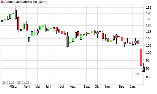 Mit dem Rücksetzer auf 88,51 EUR hat die Abbott Laboratories-Aktie (ISIN US0028241000) am 28.01.2026 ein neues 12-Monats-Tief erreicht und damit den Kurs vom 27.01.2026 eingestellt.Die ...weiterlesen