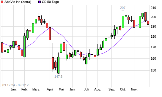 Mit dem Anstieg auf 196,20 EUR hat die Abbvie-Aktie am 02.12.2025 die 50-Tage-Linie nach oben gekreuzt.Die Abbvie-Aktie befindet sich seit dem 14.08.2025 im langfristigen Aufwärtstrend und hat ...weiterlesen