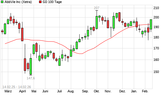 Mit dem Anstieg auf 197,80 EUR hat die Abbvie-Aktie am 13.02.2026 die 100-Tage-Linie nach oben gekreuzt.Die Abbvie-Aktie befindet sich seit dem 05.02.2026 im langfristigen Aufwärtstrend und ...weiterlesen