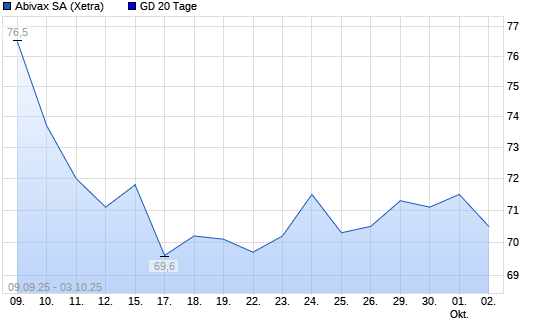 Mit dem Rücksetzer auf 69,80 EUR hat die Abivax-Aktie am 02.10.2025 die 20-Tage-Linie nach unten gekreuzt.Die Abivax-Aktie befindet sich seit dem 10.07.2025 im langfristigen Aufwärtstrend ...weiterlesen