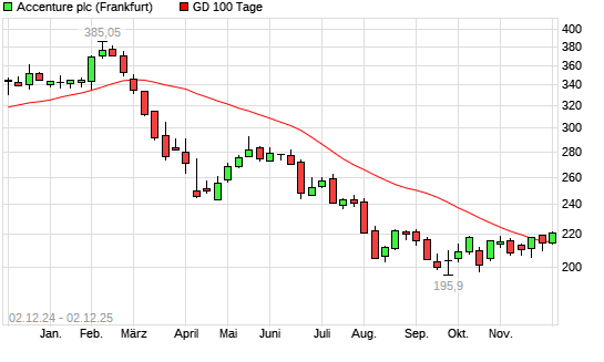 Mit dem Anstieg auf 221,50 EUR hat die Accenture-Aktie am 01.12.2025 die 100-Tage-Linie nach oben gekreuzt.Die Accenture-Aktie befindet sich seit dem 05.03.2025 im langfristigen Abwärtstrend ...weiterlesen