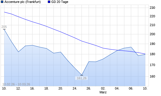 Mit dem Rücksetzer auf 178,58 EUR hat die Accenture-Aktie am 09.03.2026 die 20-Tage-Linie nach unten gekreuzt.Die Accenture-Aktie befindet sich seit dem 27.01.2026 im ...weiterlesen