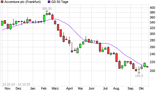 Mit dem Rücksetzer auf 210,40 EUR hat die Accenture-Aktie am 13.10.2025 die 50-Tage-Linie nach unten gekreuzt.Die Accenture-Aktie befindet sich seit dem 05.03.2025 im langfristigen Abwärtstrend ...weiterlesen
