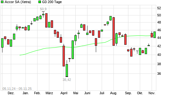 Mit dem Anstieg auf 44,48 EUR hat die Accor-Aktie am 04.11.2025 die 200-Tage-Linie nach oben gekreuzt.Die Accor-Aktie befand sich seit dem 03.11.2025 im langfristigen Abwärtstrend und hat in ...weiterlesen