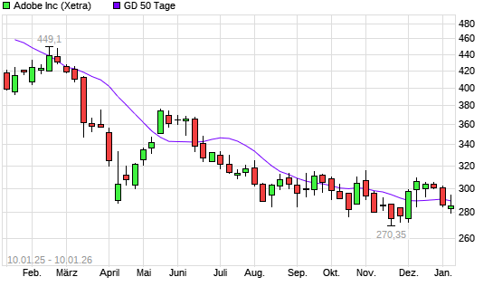 Mit dem Rücksetzer auf 285,95 EUR hat die Adobe-Aktie am 09.01.2026 die 50-Tage-Linie nach unten gekreuzt.Die Adobe-Aktie befindet sich seit dem 12.12.2024 im langfristigen Abwärtstrend ...weiterlesen
