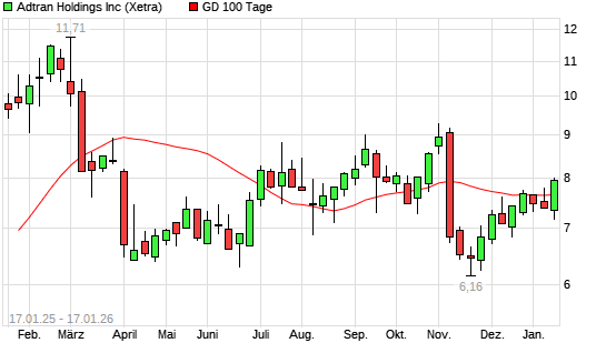 Mit dem Anstieg auf 7,76 EUR hat die Adtran-Aktie am 16.01.2026 die 100-Tage-Linie nach oben gekreuzt.Die Adtran-Aktie befindet sich seit dem 13.01.2026 im langfristigen Aufwärtstrend und hat ...weiterlesen