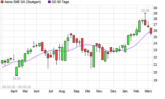 Mit dem Rücksetzer auf 25,71 EUR hat die Aena SME-Aktie am 04.03.2026 die 50-Tage-Linie nach unten gekreuzt.Die Aena SME-Aktie befindet sich seit dem 11.12.2025 im ...weiterlesen