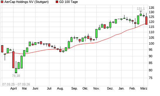 Mit dem Rücksetzer auf 117,30 EUR hat die Aercap Holdings-Aktie am 06.03.2026 die 100-Tage-Linie nach unten gekreuzt.Die Aercap Holdings-Aktie befindet sich seit dem 08.08.2025 ...weiterlesen