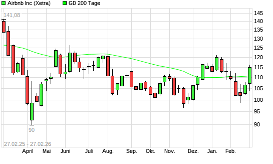 Mit dem Anstieg auf 110,90 EUR hat die Airbnb-Aktie am 26.02.2026 die 200-Tage-Linie nach oben gekreuzt.Die Airbnb-Aktie befand sich seit dem 28.01.2026 im langfristigen Abwärtstrend ...weiterlesen