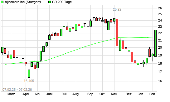 Mit dem Rücksetzer auf 23,96 EUR hat die Ajinomoto-Aktie am 05.03.2026 die 20-Tage-Linie nach unten gekreuzt.Die Ajinomoto-Aktie befindet sich seit dem 06.02.2026 im ...weiterlesen