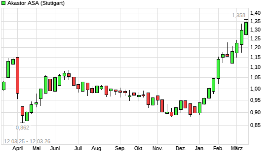 Mit dem Anstieg auf 1,34 EUR hat die Akastor ASA-Aktie (ISIN NO0010215684) am 11.03.2026 ein neues 12-Monats-Hoch erreicht und damit den Kurs vom 10.03.2026 eingestellt.Die ...weiterlesen