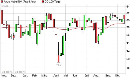 Mit dem Anstieg auf 60,64 EUR hat die Akzo Nobel-Aktie am 23.10.2025 die 100-Tage-Linie nach oben gekreuzt.Die Akzo Nobel-Aktie befindet sich seit dem 20.08.2025 im langfristigen Aufwärtstrend ...weiterlesen