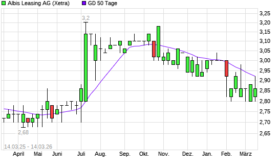 Mit dem Rücksetzer auf 2,82 EUR hat die Albis Leasing-Aktie am 13.03.2026 die 50-Tage-Linie nach unten gekreuzt.Die Albis Leasing-Aktie befindet sich seit dem 16.01.2026 ...weiterlesen