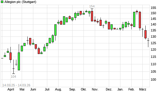 Mit dem Rücksetzer auf 125,00 EUR hat die Allegion-Aktie (ISIN IE00BFRT3W74) am 13.03.2026 ein neues 6-Monats-Tief erreicht und damit den Kurs vom 09.03.2026 ...weiterlesen