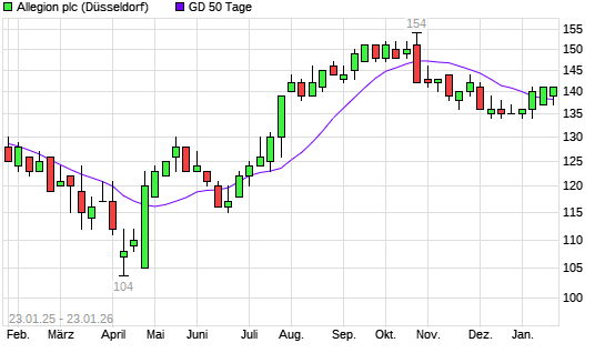 Mit dem Anstieg auf 138,00 EUR hat die Allegion-Aktie am 22.01.2026 die 50-Tage-Linie nach oben gekreuzt.Die Allegion-Aktie befindet sich seit dem 02.07.2025 im langfristigen Aufwärtstrend und ...weiterlesen