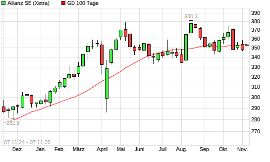 Mit dem Rücksetzer auf 353,70 EUR hat die Allianz-Aktie am 06.11.2025 die 100-Tage-Linie nach unten gekreuzt.Die Allianz-Aktie befindet sich seit dem 08.08.2024 im langfristigen Aufwärtstrend ...weiterlesen