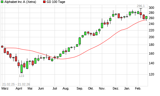 Mit dem Anstieg auf 268,10 EUR hat die Alphabet A (ex GOOGLE)-Aktie am 20.02.2026 die 100-Tage-Linie nach oben gekreuzt.Die Alphabet A (ex GOOGLE)-Aktie befindet sich seit dem ...weiterlesen