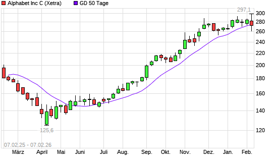 Mit dem Rücksetzer auf 272,85 EUR hat die Alphabet C-Aktie am 06.02.2026 die 50-Tage-Linie nach unten gekreuzt.Die Alphabet C-Aktie befindet sich seit dem 21.07.2025 im langfristigen Aufwärtstrend ...weiterlesen