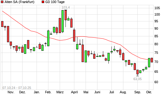 Mit dem Rücksetzer auf 69,00 EUR hat die Alten-Aktie am 06.10.2025 die 100-Tage-Linie nach unten gekreuzt.Die Alten-Aktie befindet sich seit dem 31.03.2025 im langfristigen Abwärtstrend ...weiterlesen