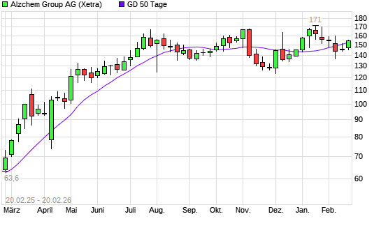 Mit dem Anstieg auf 158,00 EUR hat die Alzchem-Aktie am 20.02.2026 die 38-Tage-Linie nach oben gekreuzt.Die Alzchem-Aktie befindet sich seit dem 13.02.2026 im langfristigen ...weiterlesen