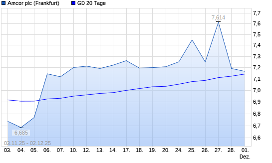 Mit dem Rücksetzer auf 7,17 EUR hat die Amcor Plc-Aktie am 01.12.2025 die 20-Tage-Linie nach unten gekreuzt.Die Amcor Plc-Aktie befindet sich seit dem 11.03.2025 im langfristigen Abwärtstrend ...weiterlesen