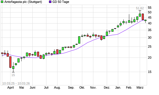 Mit dem Rücksetzer auf 41,75 EUR hat die Antofagasta-Aktie am 09.03.2026 die 50-Tage-Linie nach unten gekreuzt.Die Antofagasta-Aktie befindet sich seit dem 27.06.2025 im ...weiterlesen