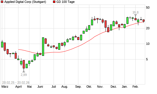 Mit dem Rücksetzer auf 26,20 EUR hat die Applied Digital-Aktie am 19.02.2026 die 100-Tage-Linie nach unten gekreuzt.Der Abstand zur 200-Tage-Linie beträgt aktuell +37,79%. ...weiterlesen