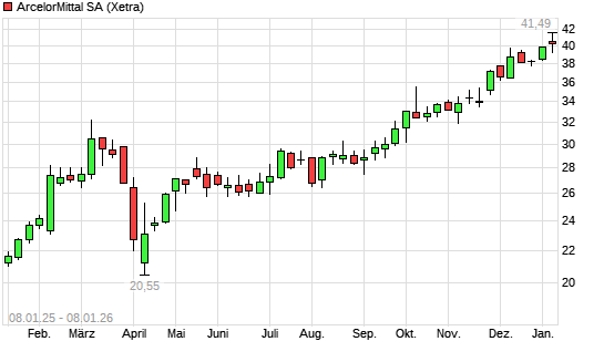 Mit dem Anstieg auf 45,76 EUR hat die ArcelorMittal-Aktie (ISIN LU1598757687) am 23.01.2026 ein neues 10-Jahres-Hoch erreicht und damit den Kurs vom 22.01.2026 eingestellt.Die ArcelorMittal-Aktie ...weiterlesen