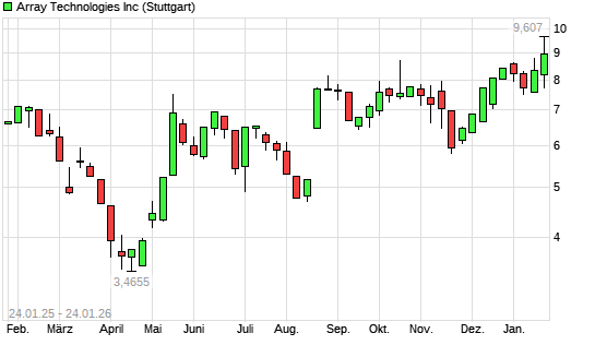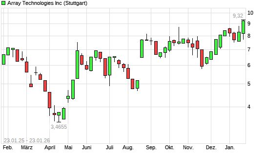 Mit dem Anstieg auf 9,24 EUR hat die Array Technologies-Aktie (ISIN US04271T1007) am 23.01.2026 ein neues 12-Monats-Hoch erreicht und damit den Kurs vom 22.01.2026 eingestellt.Die Array Technologies-Aktie ...weiterlesen