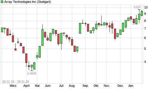 Mit dem Anstieg auf 9,35 EUR hat die Array Technologies-Aktie (ISIN US04271T1007) am 27.01.2026 ein neues 12-Monats-Hoch erreicht und damit den Kurs vom 23.01.2026 eingestellt.Die Array Technologies-Aktie ...weiterlesen