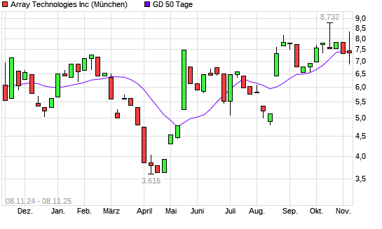 Mit dem Rücksetzer auf 7,18 EUR hat die Array Technologies-Aktie am 07.11.2025 die 50-Tage-Linie nach unten gekreuzt.Die Array Technologies-Aktie befindet sich seit dem 18.08.2025 im langfristigen ...weiterlesen