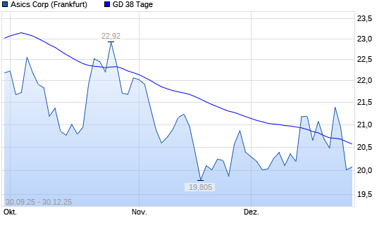 Mit dem Rücksetzer auf 20,02 EUR hat die Asics-Aktie am 29.12.2025 die 38-Tage-Linie nach unten gekreuzt.Die Asics-Aktie befindet sich seit dem 23.12.2025 im langfristigen Abwärtstrend ...weiterlesen