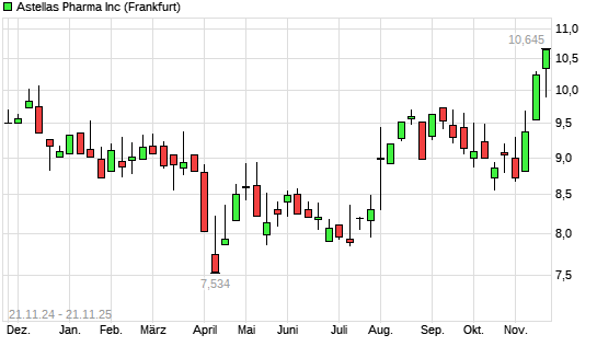 Mit dem Anstieg auf 10,56 EUR hat die Astellas Pharma-Aktie (ISIN JP3942400007) am 20.11.2025 ein neues 12-Monats-Hoch erreicht und damit den Kurs vom 19.11.2025 eingestellt.Die Astellas Pharma-Aktie ...weiterlesen