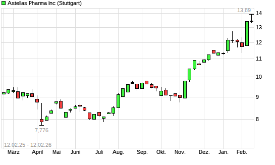 Mit dem Anstieg auf 13,70 EUR hat die Astellas Pharma-Aktie (ISIN JP3942400007) am 11.02.2026 ein neues 12-Monats-Hoch erreicht und damit den Kurs vom 10.02.2026 eingestellt.Die ...weiterlesen