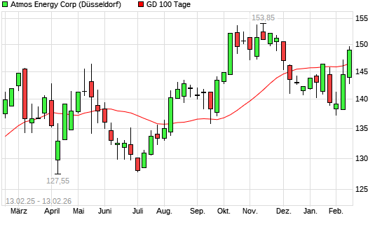 Mit dem Anstieg auf 148,10 EUR hat die Atmos Energy-Aktie am 12.02.2026 die 100-Tage-Linie nach oben gekreuzt.Die Atmos Energy-Aktie befindet sich seit dem 04.02.2026 im langfristigen Aufwärtstrend ...weiterlesen