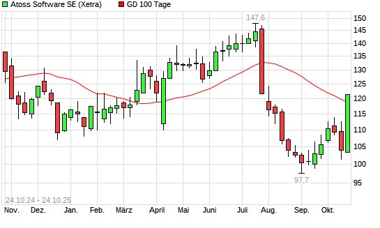 Mit dem Anstieg auf 121,00 EUR hat die Atoss Software-Aktie am 23.10.2025 die 100-Tage-Linie nach oben gekreuzt.Die Atoss Software-Aktie befindet sich seit dem 25.07.2025 im langfristigen Abwärtstrend ...weiterlesen